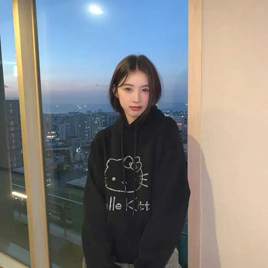 Hello Kitty Diamond Velvet Hoodie for Women | Luxurious Loose Autumn Winter Coat with Pockets