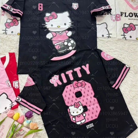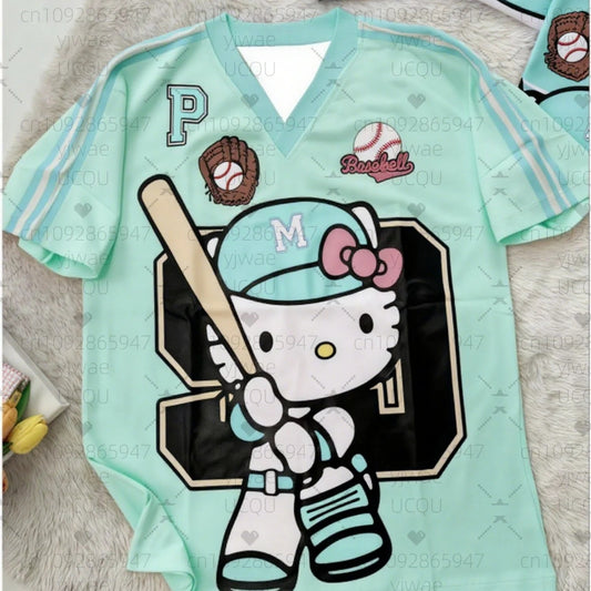 Hello Kitty Oversized V-Neck Baseball T-Shirt For Casual Summer Sports Wear