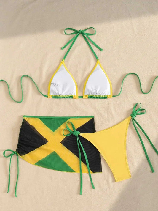 Jamaican Flag Micro Split 3 Piece Bikini Set with Triangle Top & Cover-Up Skirt