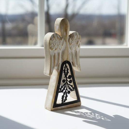 Whitewashed Mango Wood Angel With Iron Cut-Out – 18cm Christmas Decor
